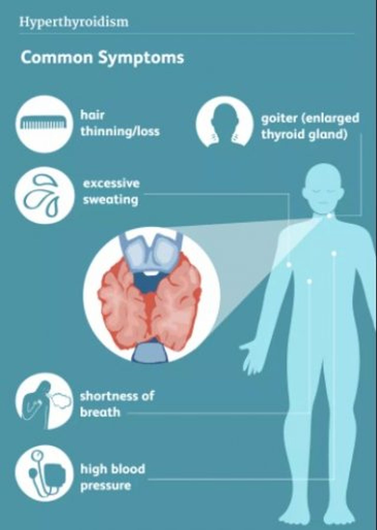 इसके कारण बॉडी की मसल्स में थकान और कमजोरी महसूस हो सकती है। सबसे पहले थाईज यानि जांघों पर असर होता है। सीढ़ियां चढ़ना और साईकिल चलाना जैसी मामूली कवायद भी भारी लगने लगती है।कुछ और लक्षण भी हो सकते हैं जिनमें अचानक वजन कम होना, हमेशा बुखार महसूस होना, दिल की धड़कनें हमेशा बढ़ी रहना, प्यास ज्यादा लगना।