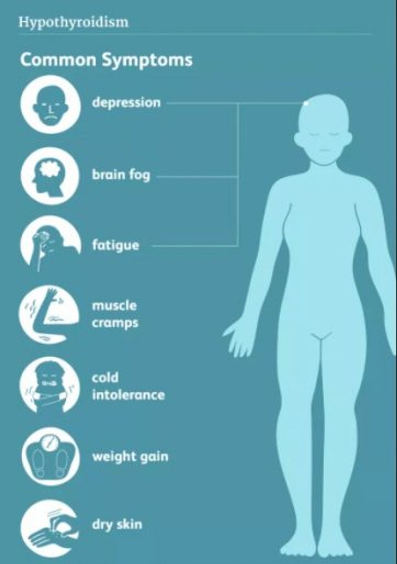 इसके कारण थकान, काम में मन न लगना, थोड़ी सी मेहनत में ही शरीर टूटने जैसा अहसास होना जैसे लक्षण हो सकते हैं। अचानक वजन बढ़ जाना , गर्म मौसम में भी ठंड का अहसास होना और कब्ज भी हायपोथाइरॉयडिज्म के लक्षण हैं।