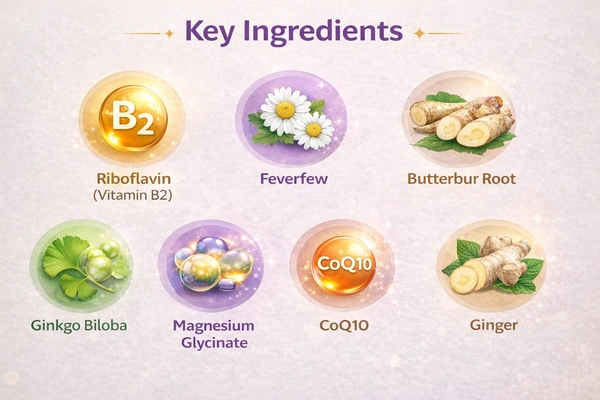 This formula combines Riboflavin (Vitamin B2), Magnesium Glycinate, Coenzyme Q10, Feverfew, Butterbur, Ginkgo Biloba, and Ginger Extract — ingredients commonly used in wellness routines for individuals seeking support for occasional headaches and sensitivity to light and sound.
