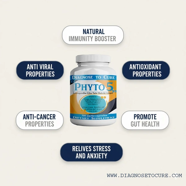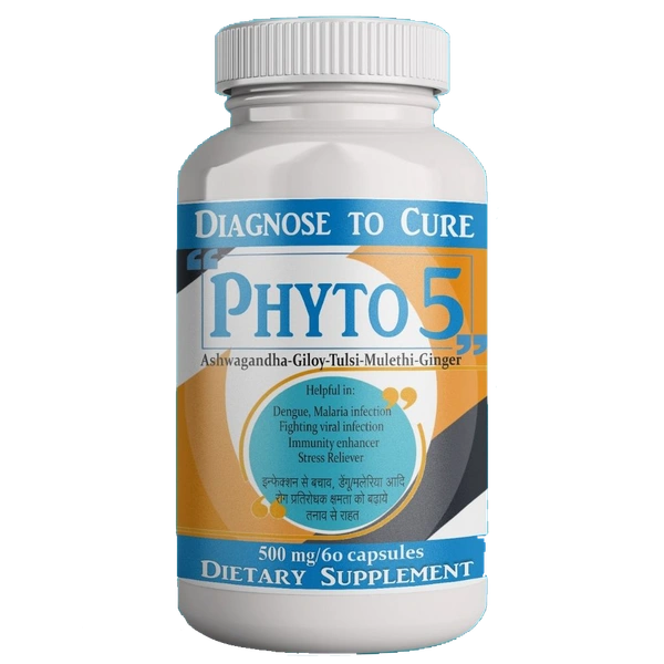 Phyto-5 is a premium herbal blend designed to naturally boost immunity, aid digestion, and relieve stress. Each 500 mg capsule is packed with plant-based power to energize your body and calm your mind. Safe, natural, and effective—your daily support for complete wellness.
