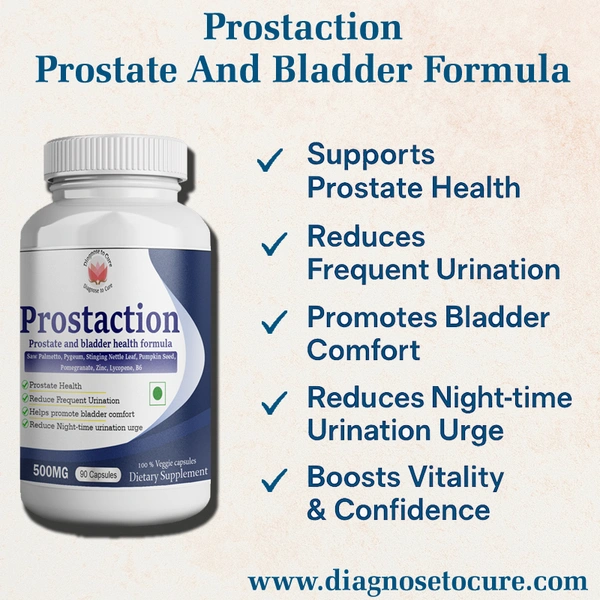 Prostaction, from Diagnose To Cure, is a premium formula designed to provide maximum care for prostate and urinary health. Packed with scientifically backed natural ingredients, this advanced blend supports healthy urine flow, reduces inflammation, and promotes optimal prostate function, helping you regain control and comfort in your daily life.