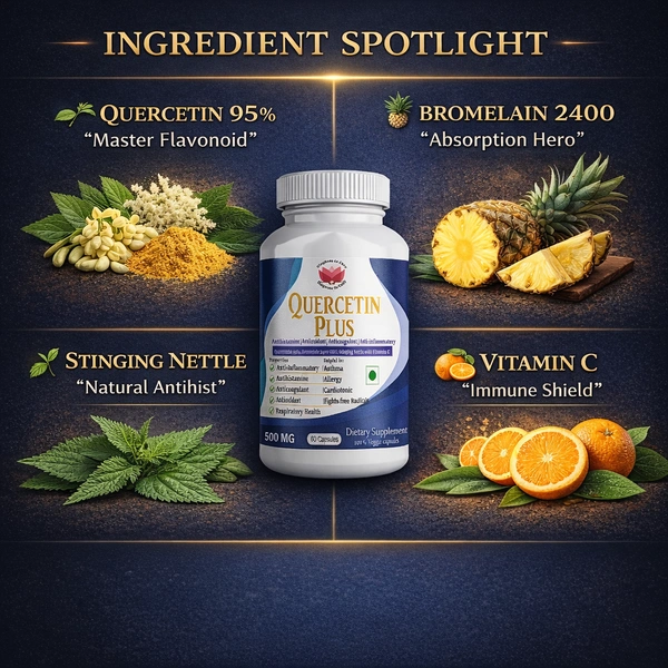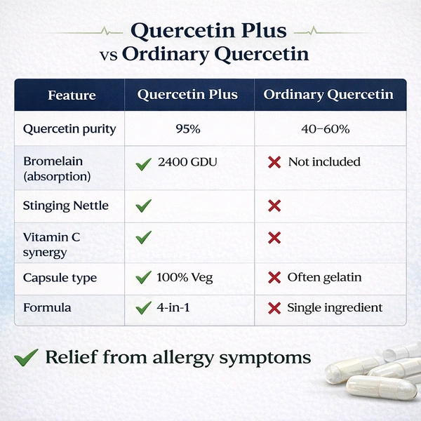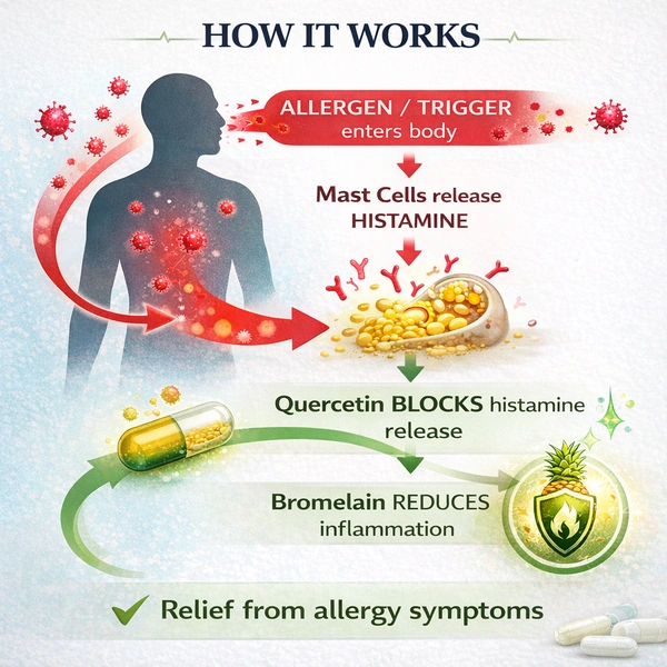 Quercetin is a natural antioxidant and antihistamine, while Bromelain helps enhance its absorption and supports inflammation relief, making the combination especially effective for allergies and sinus health.