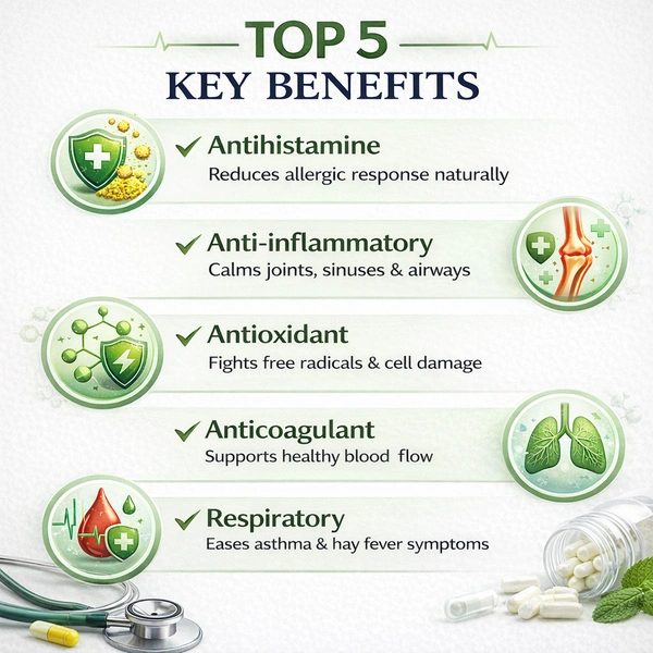 ✅ Natural Antihistaminic – Reduces histamine levels and relieves allergies.