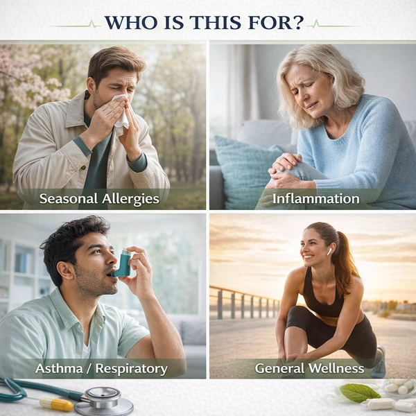 This formula is designed to support immune health, allergy relief, respiratory wellness, and inflammation control.