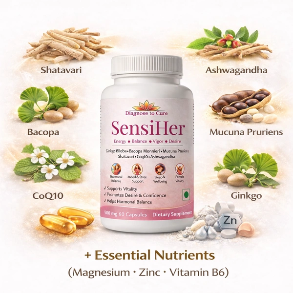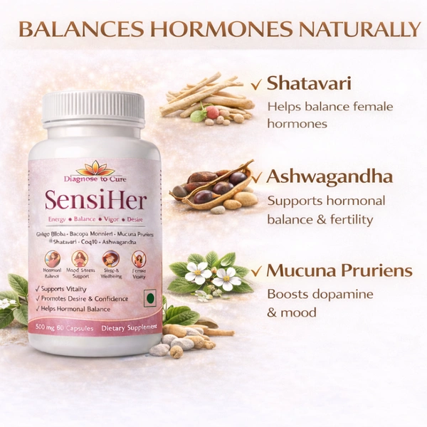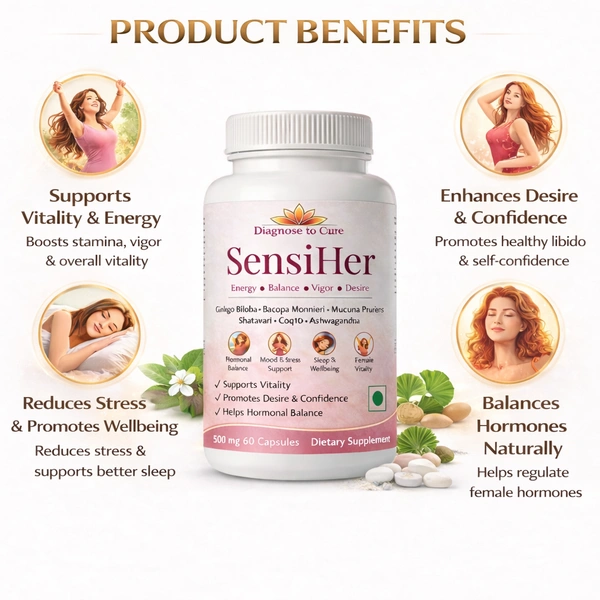 SensiHer by Diagnose to Cure is an advanced women’s wellness formula designed to support energy, hormonal balance, vitality, mood, and natural desire. This carefully formulated supplement blends traditional Ayurvedic herbs with modern nutritional science to help women maintain overall physical and emotional wellbeing.
