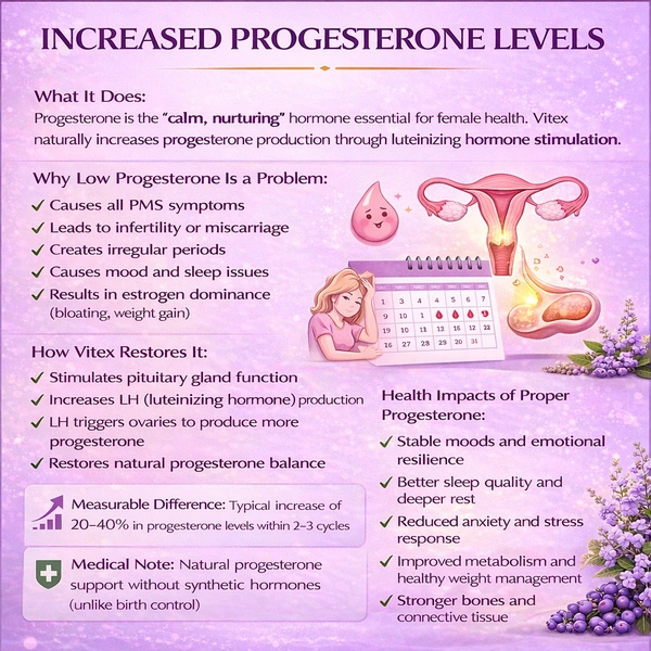 Vitex is believed to influence the pituitary gland, which regulates hormone production. It helps balance estrogen and progesterone levels, supporting overall hormonal harmony.