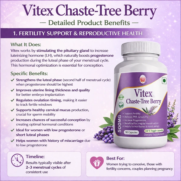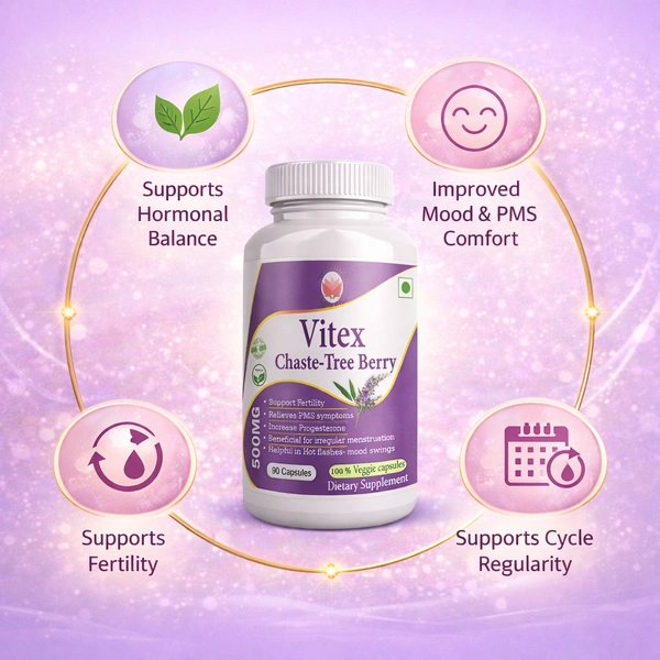 Find natural relief with our Vitex (Chaste tree berry) 500mg for PCOS & Hormone Balance. This herbal supplement is designed to support menstrual regularity, ease PMS and menopause symptoms, promote fertility, and reduce hormonal acne for overall vitality, Vitex is your herbal support for hormonal health and overall vitality.