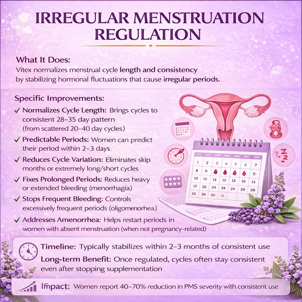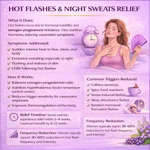 Vitex is believed to influence the pituitary gland, which regulates hormone production. It helps balance estrogen and progesterone levels, supporting overall hormonal harmony.